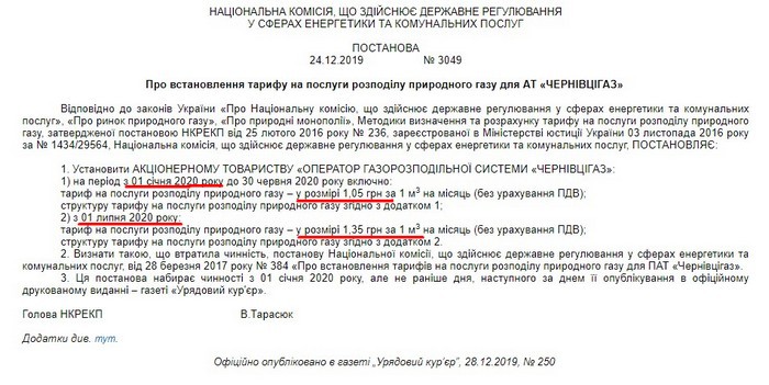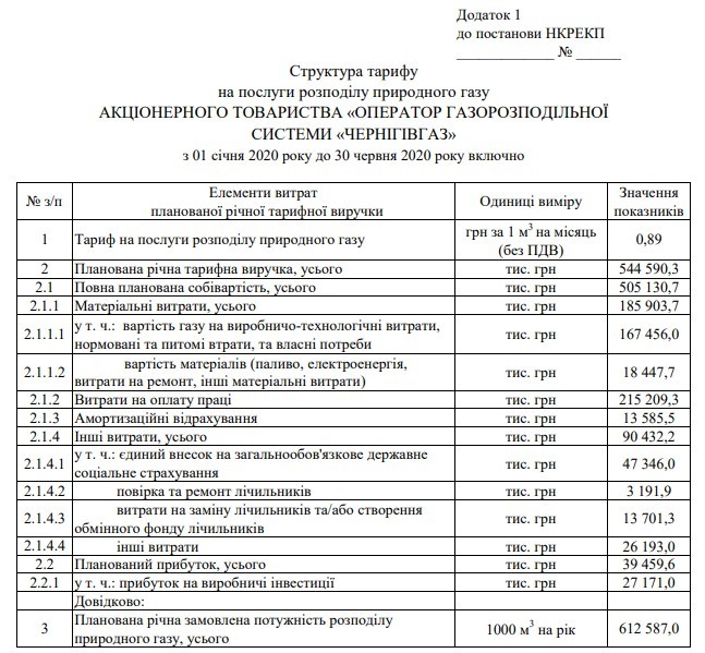 Чинний тариф на розподіл (доставку) для АТ «Чернігівгаз» з 1 січня 2020 року складає 1,07 грн. (з ПДВ).