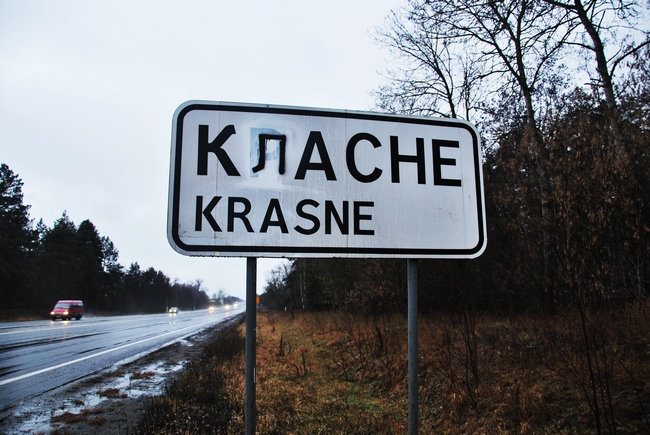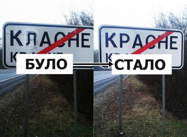 Недавно мы ездили в командировку в Козелец и на въезде в село Красное Черниговского района заметили, что название на знаке другое — «Класне». Кто-то«переименовал» населенный пункт, просто зарисовав краской букву «р» и написав поверх «л». Причем на обеих табличках — на обозначении въезда со стороны Чернигова и выезда (два аналогичных знака со стороны Киева не тронули). Возможно, это какой-то красненский патриот таким образом выразил восхищение своим селом?