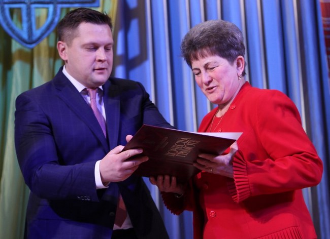 Андрій Прокопенко вручає грамоту Кабміну Ніні Симоненко