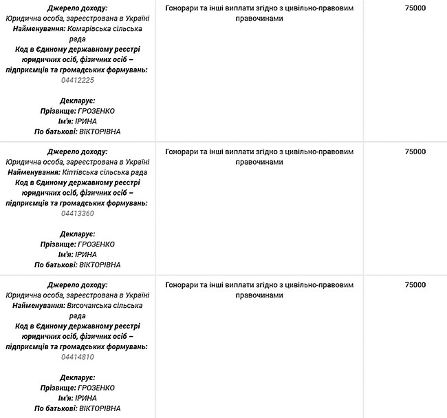 Ще одна стаття доходу – гонорари та інші виплати згідно з цивільно-правовими правочинами. Сума цих гонорарів у 2016-му році склала майже 31 тисячу гривень. За якими саме договорами, яку роботу і хто конкретно її оплачував, у декларації не зазначено. Одначе у її колеги Ірини Грозенко, яка є головою постійної комісії обласної ради з питань розвитку і реформування місцевого самоврядування, децентралізації та європейської інтеграції, а також очолює Чернігівське регіональне відділення Всеукраїнської асоціації сільських та селищних рад, є ідентична стаття доходів. І в ній вже конкретно зазначено, хто і скільки їй заплатив гонорарів за цивільно-правовими правочинами. А заплатили гонорари експерту-децентралізатору… не такі вже й багаті територіальні громади. Уявляєте: окремі об’єднані територіальні громади платять пані Грозенко гроші за цивільно-правовими угодами? Цікаво, за що? У декларації за 2018 рік зареєстровано три такі громади: Комарівська, Кіптівська та Височанська (саме та, де голова отримує близько 38 тисяч гривень доходу щомісяця – з донарахуваннями, преміями і так далі).