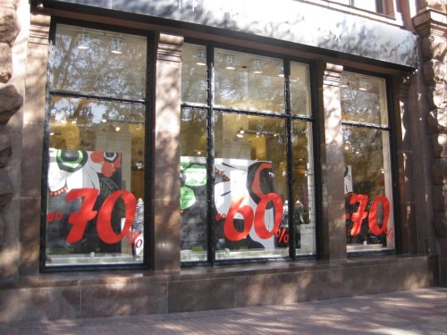 Поэтому, вернувшись вчера из очередной поездки в Киев, спешу рассказать вам следующее. Два раза в год, в конце зимы и в конце лета, в столице проходят распродажи. Причем не такие, как у нас, где пишут «до 50% скидка», а на самом деле скидка составляет 10-20 процентов максимум на хорошие вещи. Дешево же можно купить только то, что уже давно не в моде. В Киеве в фирменных «бутиках» среднего класса, сейчас действуют скидки до 70%. Но при этом выбор довольно широкий: джинсы, футболки, блузки, рубашки. Все дешевле в 2-3 раза!