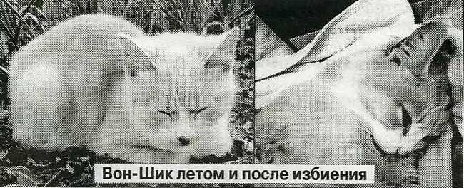 Через неделю (и снова - в пятницу!) пострадал кот 34-летней Алены Юрловой: его нашли окровавленным у чужого двора. Было видно, что Вон-Шика (так зовут кота) били в живот чем-то тупым (возможно, ногой). Он выжил, но получил огромный стресс. Поэтому бедное животное дрожит и отказывается есть. Алена поит кота водой из пипетки.