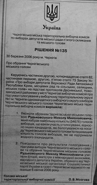 2. Повідомити про результати голосування і підсумки виборів Чернігівського міського голови та обрання Чернігівським міським головою Рудьковського Миколу Миколайовича учителя історії, магістра з міжнародної економіки, народного депутата України, обраного від Чернігівської міської організації Соціалістичної партії України в газеті «Чернігівські відомості» не пізніше 6 квітня 2006 року.