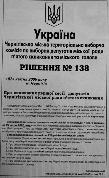 Скликати першу сесію депутатів Чернігівської міської ради п’ятого скликання 27 квітня 2006 року в сесійній залі Чернігівської міської ради за адресою: м.Чернігів, вул Магістрацька,7, про що повідомити депутатів міської ради п’ятого скликання та новообраного Чернігівського міського голову в газеті «Чернігівські відомості» та особисто. Затвердити порядок денний сесії Чернігівської міської ради: