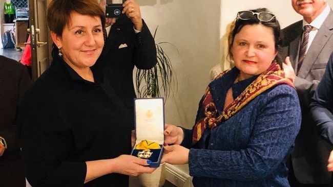 Наталія Реброва, генеральний директор Національного заповідника «Гетьманська столиця», отримує копію Ордена Меча для виставки у Батурині від Катерини Капіньш, керуючої Талліннським музеєм лицарських орденів