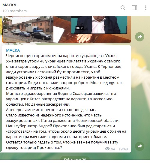 Вечером, 19-го февраля на Телеграм-канале МАСКА появилось сообщение о том, что якобы наша область также примет на карантин пассажиров с самолета , что прилетел из Уханя.