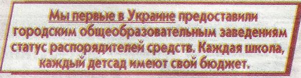 — Мы первые в Украине предоставили городским общеобразовательным заведениям статус распорядителей средств. Каждая школа, каждый детсад имеют свой бюджет. Учредили скайп-совещания и видеоконференции со старостами. Для этого в ста-ростатах есть автономный Интернет. Воплощается план создания лыжной базы. Ищем хорошего тренера.
