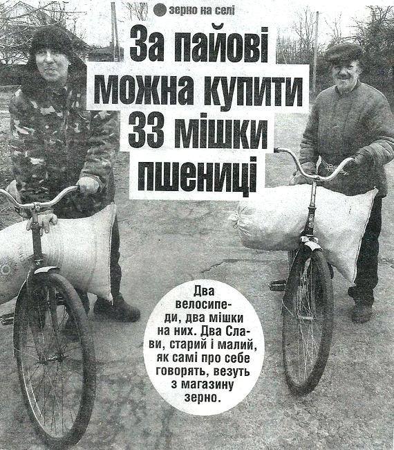 — Украв і везе пропить, — жартує про батька 45-річний В’ячеслав Бреус із Феськівки Менського району. — Та ні, помолоть везе. Господарство ж годувати треба чимось. За пай Кролевецький комбікормовий завод (Сумщина), який орендує у нас землі, віддає грошима, їм так простіше, ніж зерном. А щоб домашнє хазяйство годувати, купляємо. Кілограм пшениці — 4 гривні. За мішок — 200 гривень.