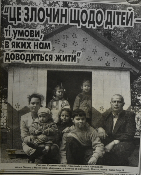 Не випадково на першій сторінці родину Клементьєвих-Лащенків знято біля дитячого будиночка. Як і герої відомої казки „Теремок”, Сергій та Олена разом із п’ятьма дітьми змушені тіснитися у невеликому помешканні — двокімнатній квартирі з житловою площею усього 26,8 кв. м(!) Якщо розділити її на 7, вийде приблизно 3,8 квадратного метра на кожного — при санітарній нормі 6 метрів. Пам’ятаєте, чим закінчилася згадана казочка? Правильно — крахом „теремка”.