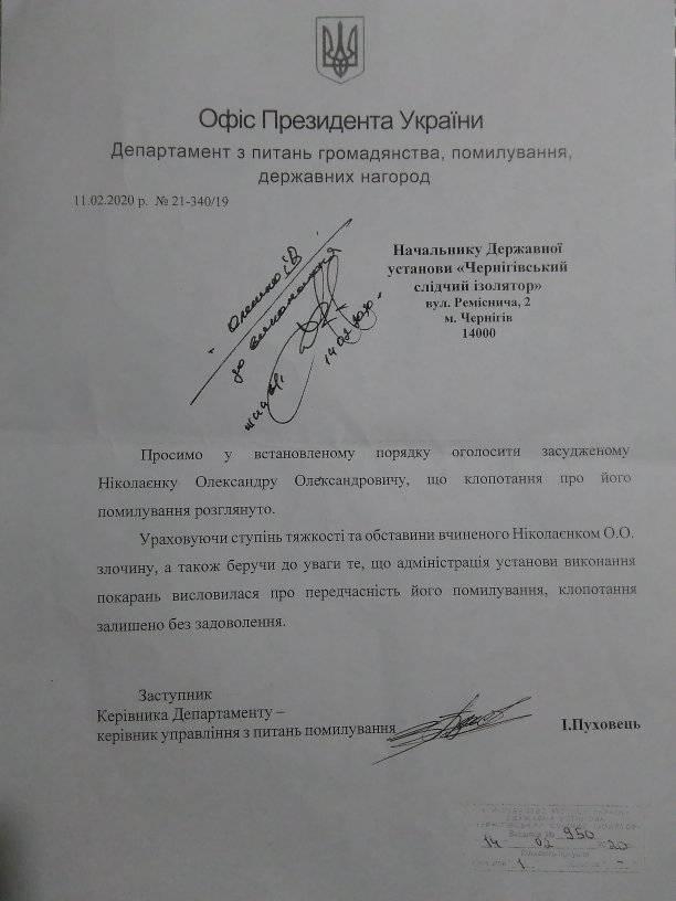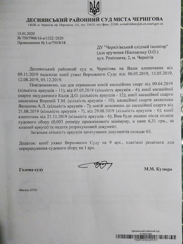 Так, например, 15.01.2020 глава Деснянского райсуда Николай Кузюра прислал Александру Николаенко письмо, в котором сообщил, что оказывается, для получения копий документов, что есть в его деле необходимо платить деньги. И не то, чтобы родственники Николаенко не могли сами сделать копии, ЕСПЧ требует для пакета документов копии именно с отметкой суда. А по украинскому законодательству осужденным предоставляются все эти копии – бесплатно.