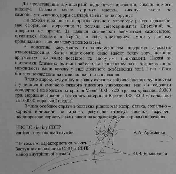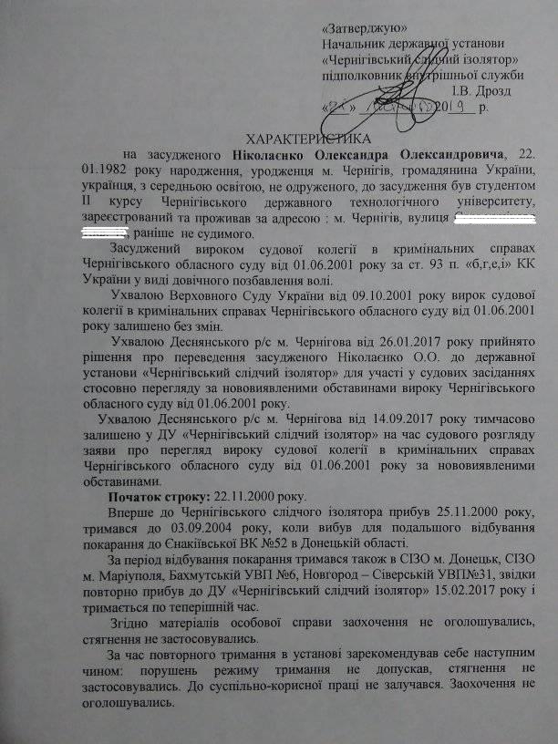 К прошению прилагалась характеристика, заверенная начальником черниговского СИЗО Игорем Дроздом от 25.02.2019. В этом документе сказано, что: