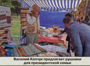 Житель села Яворов Косовского района Ивано-Франковщины, 47-летний Василий Копчук, приехал торговать одеялами, покрывалами и другими изделиями, которые делает с женой. Пока президент выступает, к нему подходят двое работников Госохраны.