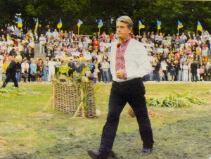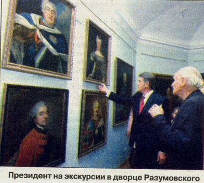 В субботу в 11.40 президент прилетел на вертолете в Батурин. С опозданием всего-навсего на 10 минут он появился на Певческом поле, где завершался концерт победителей конкурса бандуристов имени Остапа Вересая. Глиняные сувениры и музыкальные инструменты, разложенные в палатках, не обращает внимания. Со сцены он произносит короткую речь ко Дню независимости и ко дню открытия дворца.
