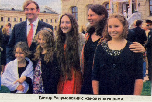 Рядом с нами девочки весело переговариваются на немецком. Это четыре дочери потомка Разумовских — 48-летнего графа Григора. Он приехал из столицы Австрии Вены. Украинский понимает, но общается через переводчика. Дети наш язык не знают. Григор привез в подарок казацкую саблю XVII ст. из семейной коллекции.