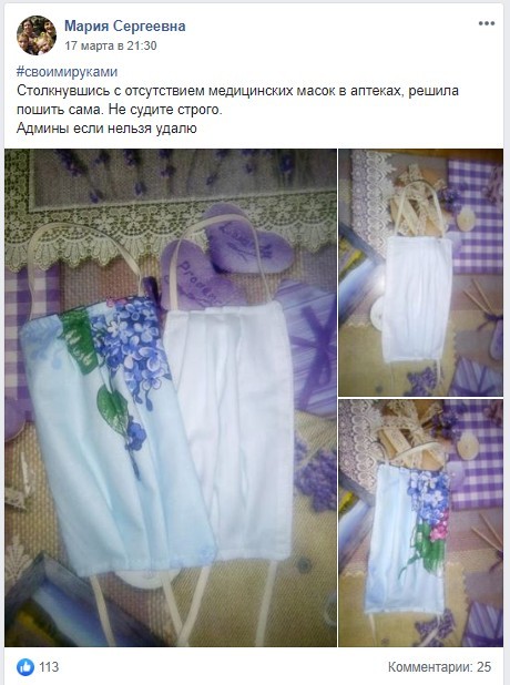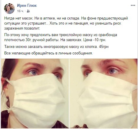 В связи с пандемией коронавируса в стране на данный момент существует дефицит таких товаров, как защитные маски и дезинфицирующие средства. В аптеках масок практически нет, в интернете их продают по 500 гривен за упаковку. И если с дезраствором можно выйти из ситуации, сделав его самому, рецепт от ВОЗ мы публиковали на нашем сайте, то маски почему-то шить самостоятельно из подручных материалов люди ленятся. Хотят получить готовое, заплатил - надел и пошел.