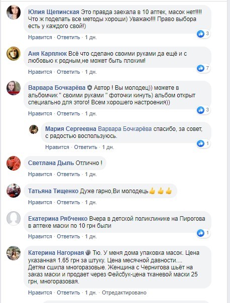 В Фейсбуке мы с ходу нашли сразу три объявления от Галины Ратневской, Ирины Глюк и девушки по имени Мария, которые предлагают отшивать маски на заказ. Цены от 10 до 45 гривен. Лично нам больше всего понравилась – синяя в белый горошек от Ратневской, в такой не стыдно и селфи сделать:-) В комментариях потенциальные клиенты хвалят рукодельниц и сообщают, что на американских сайта хенд-мейд товаров видели маски с аппликациями, стразами и необычными стильными рисунками. Поэтому скоро в городе можно будет наблюдать не обычные маски, а так сказать авторские, с изюминкой.
