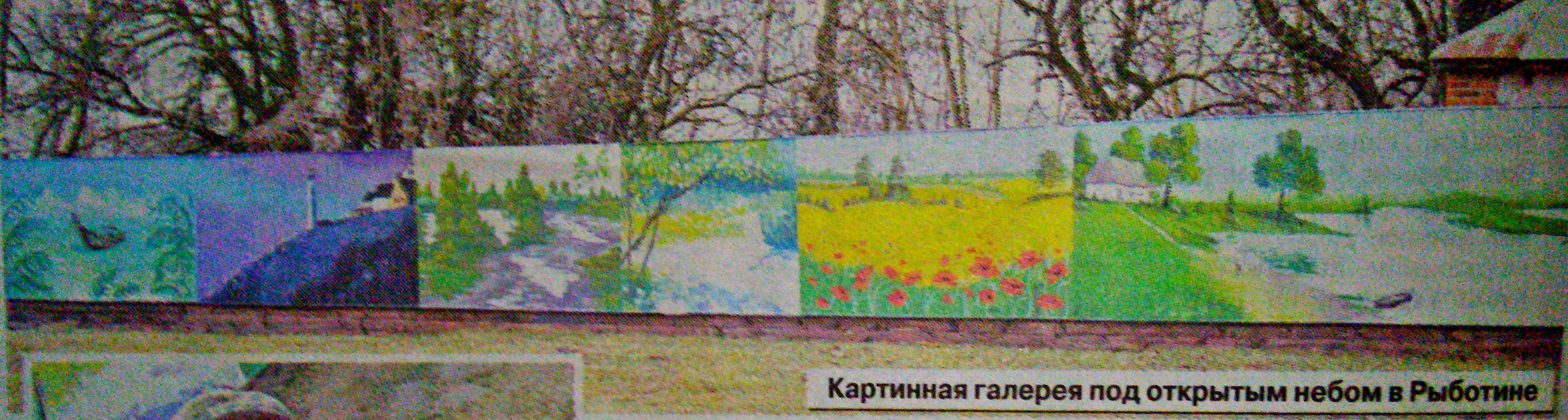 Крутые берега Десны, лошади на лугу, золотистое пшеничное поле с яркими маками — близкие сердцам жителей Рыботина (Коропский район) пейзажи протянулись на 74 метра вдоль центра села. Картины, высота которых около 2 м, написаны акриловыми красками на обыкновенном деревянном заборе из узеньких дощечек, который в прошлом году установили возле летней сцены. Идея оживить таким образом центр села принадлежит и. о. старосты Рыботина Владимиру Капице.