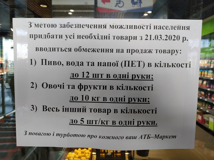 Везде персонал магазинов находился в масках. В АТБ на входе покупателей встречает объявление, что вводится ограничение на продажу некоторых товаров: