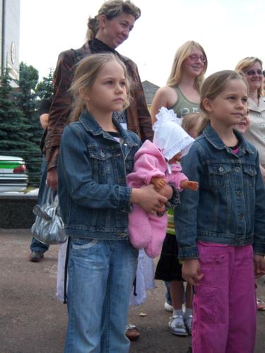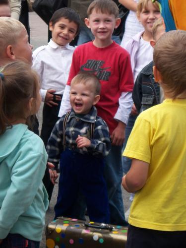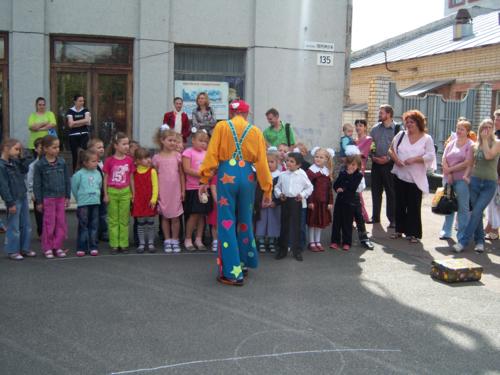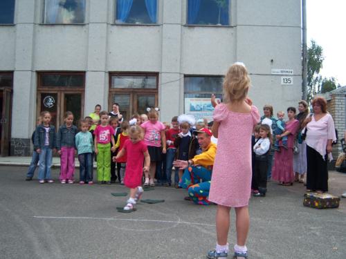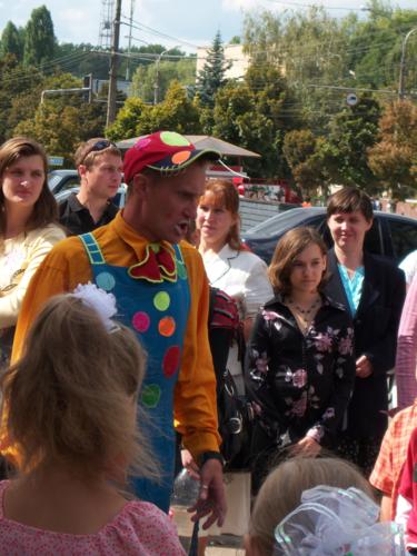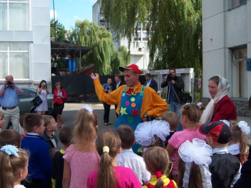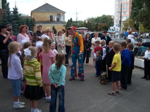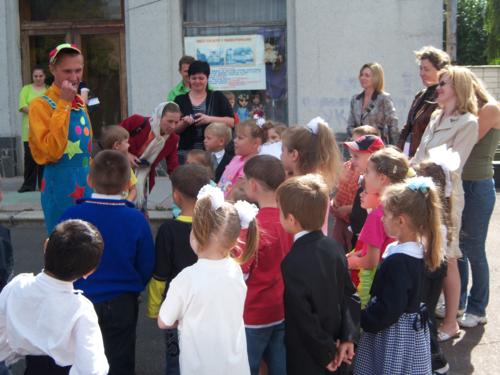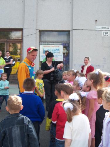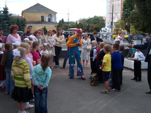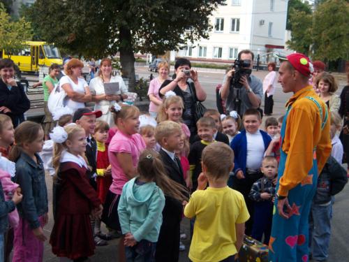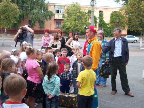 Сьогодні до Чернігова з’їхалось півсотні дітей з багатодітних родин області. Приїхали зі своїми батьками, щоб отримати напередодні першого вересня подарунки у вигляді канцелярських приладь. Дітей перед Ляльковим театром розважав клоун.