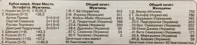 Вернемся же к украинцам. Прима, Семенов, Ткаленко и Пидручный повторили наилучший результат в истории мужской эстафетной команды Украины на этапах Кубка мира, который держался почти двадцать лет. 3 декабря 2000 года в австрийском Хохфильцене сборная Украины, в составе которой так же, как и 7 марта 2020-го в Нове Место, бежали трое черниговцев (тогда это были Вячеслав Деркач, Андрей Деризем-ля, Руслан Лысенко и сумчанин Александр Биланен-ко), финишировала второй.