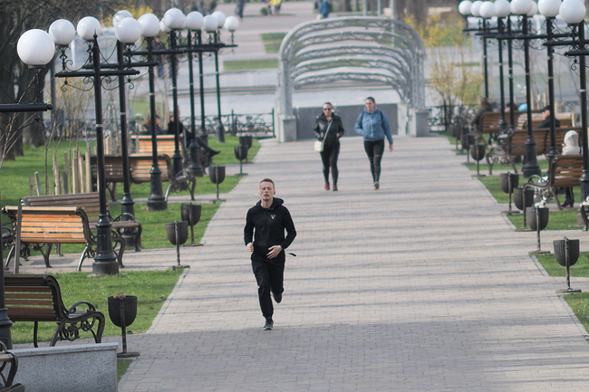 На прогулку кто-то вышел пешком, кто-то едет на велосипеде, а некоторые совмещают прогулку с пробежкой. Многие не расстаются с масками, но большинство без них. Вышли на аллеи парков и уличные музыканты, чтобы поднять настроение жителям города. Говорят общенациональный карантин не мешает прогулкам. Особенно школьникам, которые сейчас учатся дистанционно. Они собираются возле «Зеленой сцены» и осваивают трюки на скейтборде.