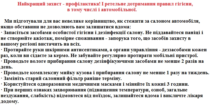 - при прийомі Вашого авто на сервіс, використовуємо індивідуальні захисні матеріали для керма, сидіння водія, а також обробляємо авто антисептичними засобами.