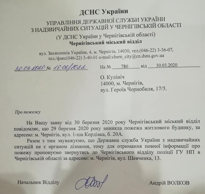 - 29 березня близько 4-ї ранку надійшло повідомлення на службу 102 від мешканки Чернігова, яка побачила пожежу будинку. Інформацію передано ДСНС. В подальшому з’ясувалося, що пожежа відбувається в буд. 20А по вулиці 1-А Кордівка. Рятувальники локалізували, а згодом і загасили пожежу. На згарищі було виявлено обгоріле тіло 26-річного чернігівця.