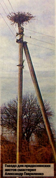 ... Об аистах, поселившихся в Придеснянском (село Городищенского старостинского округа Коропского района), первой этой весной начала беспокоиться его жительница — 24-летняя Надежда Цупко. Именно она сообщила в старостат, что птичьей семье некуда возвращаться, так как гнездо сняли со столба энергетики — оно мешало работе электросети.