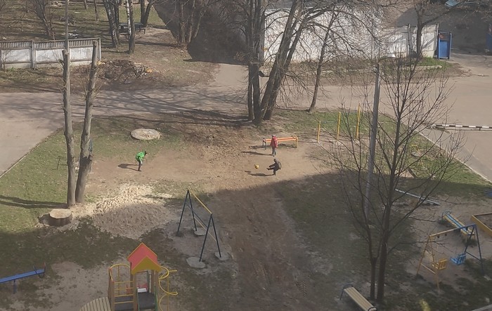 2 апреля, дети играют в футбол на площадке. В том месте, где пролетает мяч, должна была проходит новая дорожка из тротуарной плитки