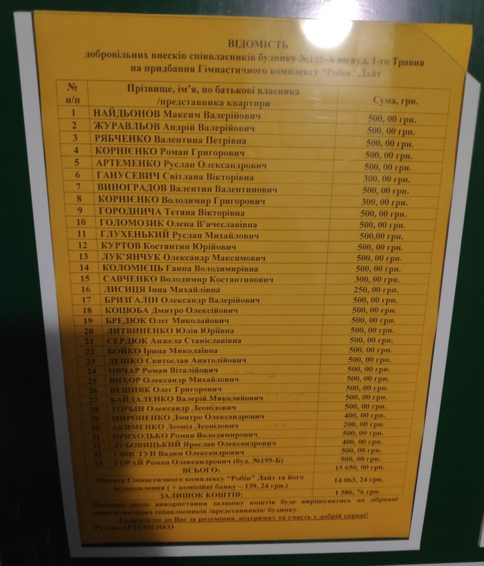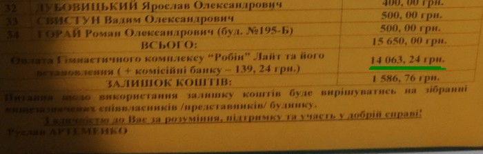 К слову сказать, первыми снарядами, которые появились на данной детской площадке, были качели и некий гимнастический комплекс. На качелю жильцы из домов №195а и 189а собрали 6000 грн. самостоятельно, а на спортивный снаряд «Робин» Лайт – 14 063 грн. сбор денег вел глава ОСМД Руслан Артеменко. И если качели у детей пользуются популярностью, то к спортивному снаряду они подходят, только чтобы подергать за канат, так как иным способом просто не способны использовать данное сооружение.