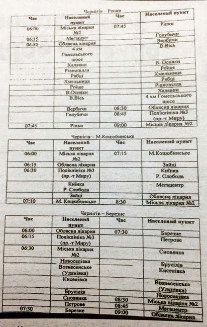 Чернигов (6.00) — Березна (7.30) — Чернигов (8.30).