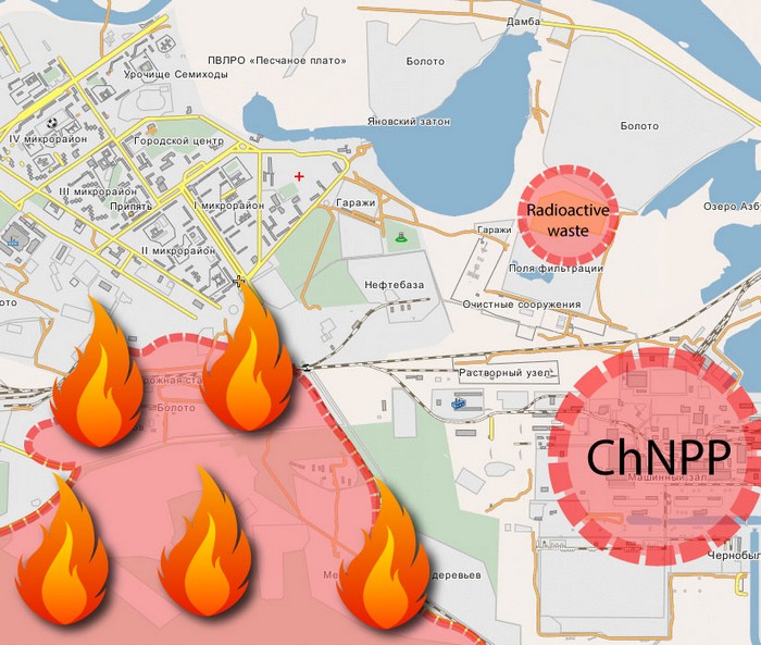 "Зараз вогонь дістався Прип’яті та знаходиться у двох кілометрах навпростець від сховищ радіоактивних відходів "Підлісний", де розташовані найбільш високоактивні радіаційні відходи всієї Чорнобильської зони, та від самої ЧАЕС", - заявив він.