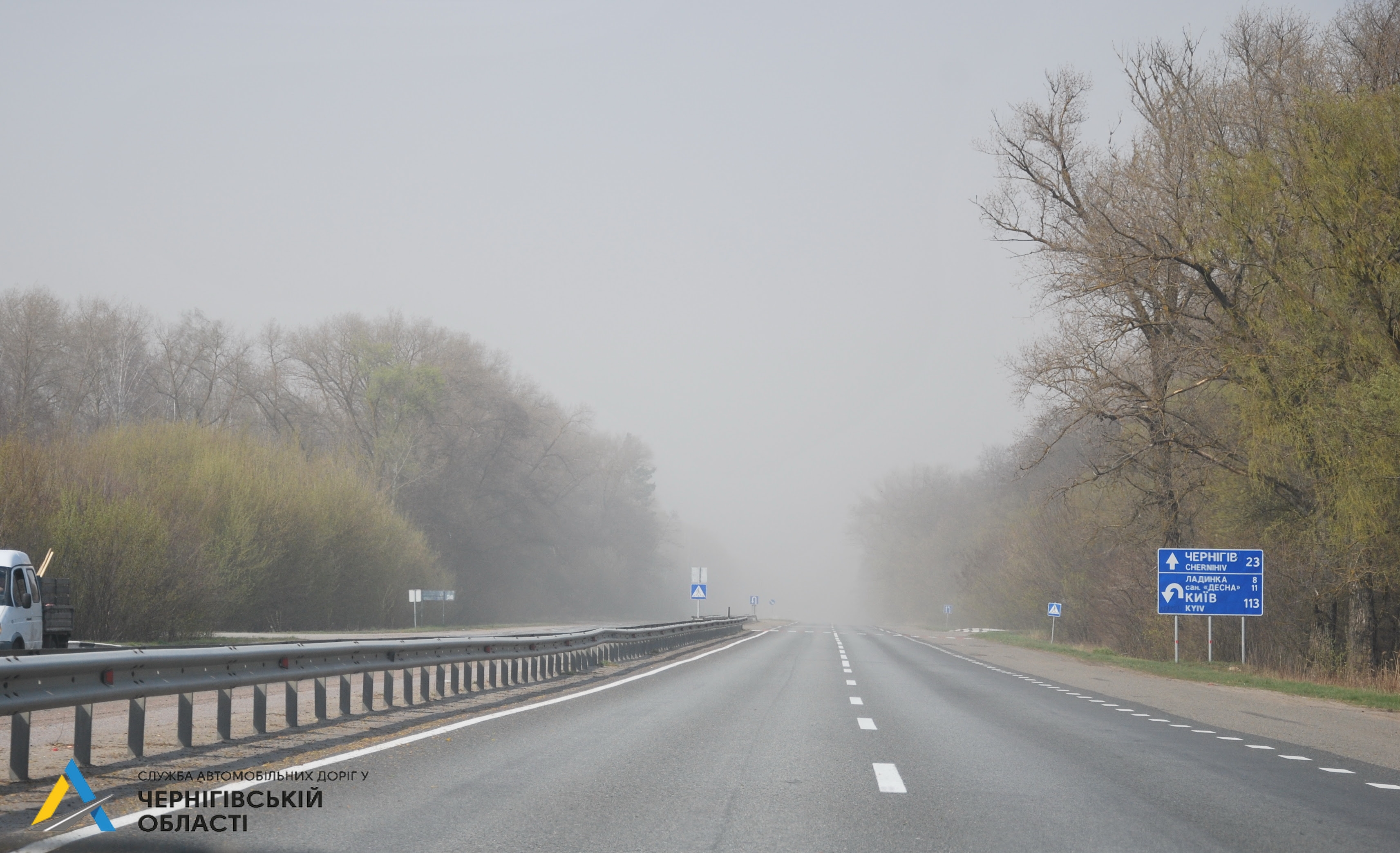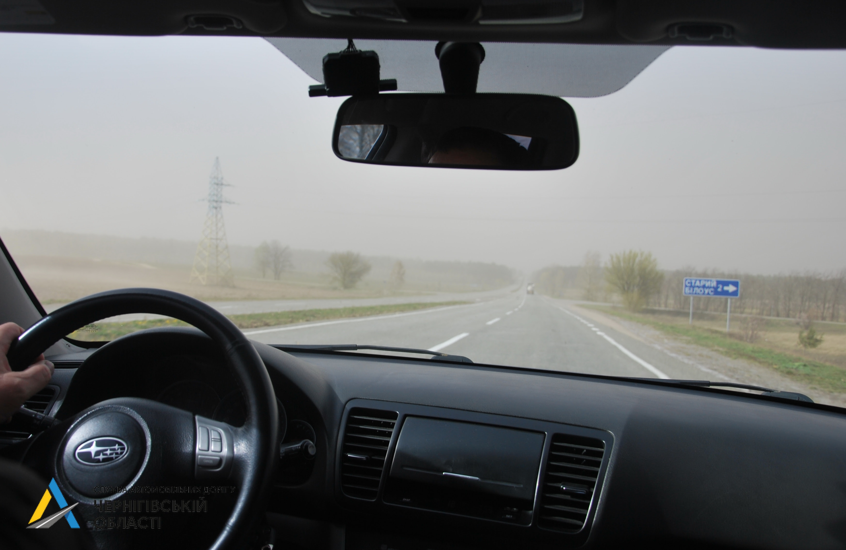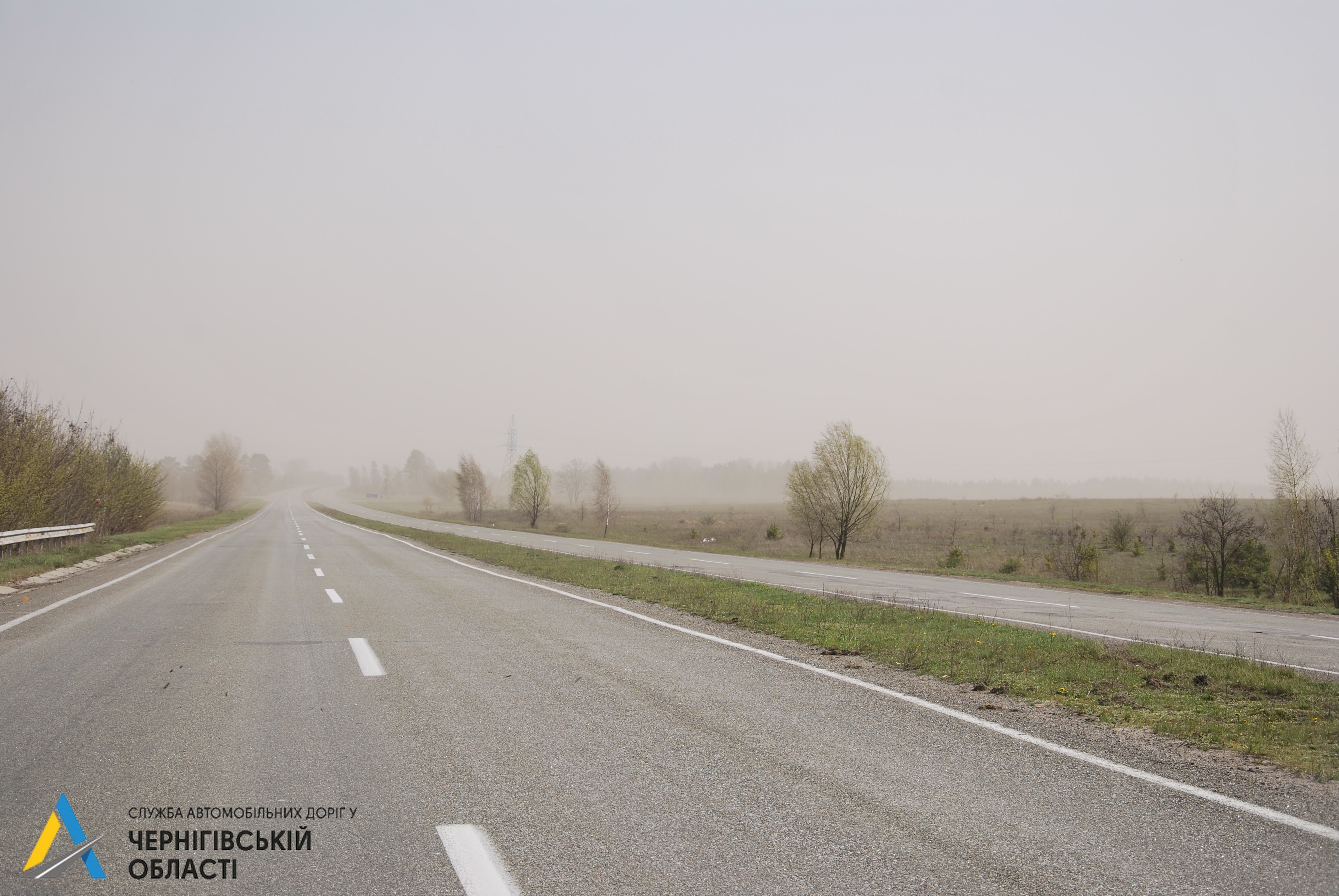 До уваги водіїв! Через сильний боковий вітер та пил з полів місцями можлива обмежена видимість проїзної частини. На фото - автомобільна дорога М-01 Київ-Чернігів-Нові Яриловичі, Чернігівський район. Будьте уважні за кермом, обирайте безпечну швидкість та дистанцію руху. Для оперативного реагування на надзвичайні ситуації на дорогах загального користування державного значення Служба автодоріг у Чернігівській області має цілодобову гарячу лінію: