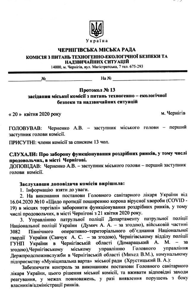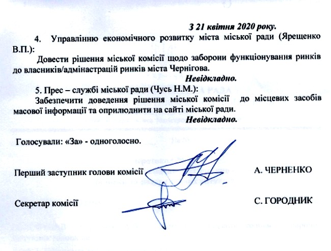 Таке рішення прийняте Комісією з питань техногенно-екологічної безпеки та надзвичайних ситуацій Чернігівської міської ради 20 квітня на виконання постанови Головного санітарного лікаря України від 16.04.2020 №10 "Щодо протидії поширенню коронавірусної хвороби (COVID-19) в місцях торгівлі".