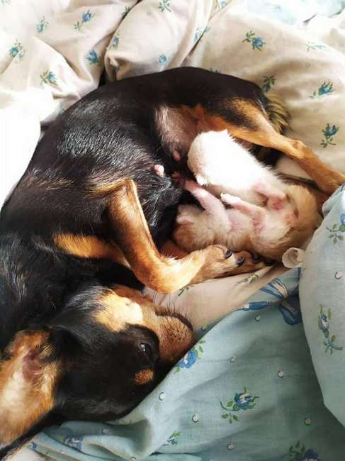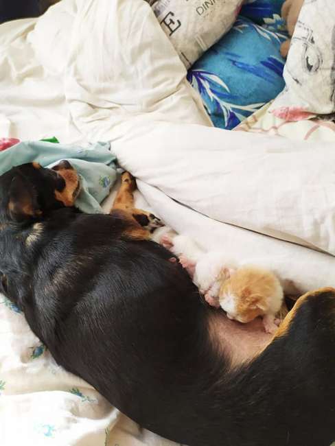 - Мы оба очень любим животных, поэтому постоянно помогаем беспризорным. Каждую весну у нас какие-то малыши на выкармливании, — говорит Виктория. — Правда, в Нежине никого брать не собирались - из-за работы на это нет времени. А тут увидели объявление и решили, что все-таки нужно помочь, тем более что из-за карантина и время появилось. Самыми тяжелыми были первые два дня. Котята постоянно плакали, мы с мужем дежурили возле них — проверяли, чтобы не было температуры, через каждые два часа кормили. Все это время рядом ходила наша собака Гайка - ее мы восемь лет назад в Полтаве подобрали на улице. Щенков у Гайки никогда не было. И к котятам она не проявляла никакого интереса. Но через два дня у нее... появилось молоко. Мы подложили ей котят, и Гайка начала их выкармливать. Теперь носится с ними, как настоящая мама.