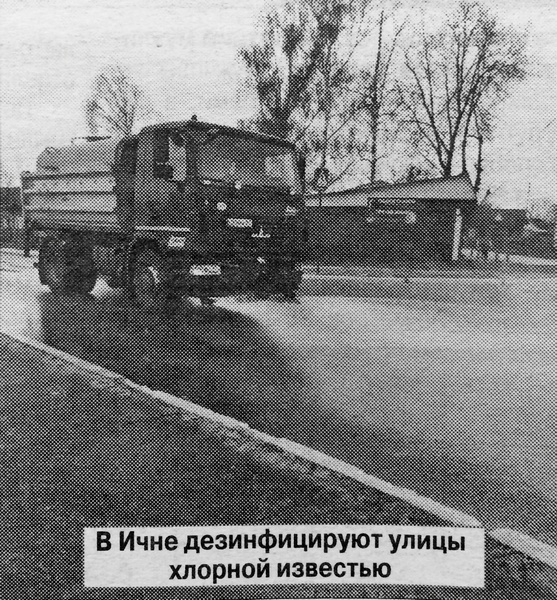 В Ичне сотрудники КП «Ичнянское» раствором хлорной извести поливают улицы, остановки общественного транспорта, детские площадки, продовольственные рынки и все места, где в период карантинных мероприятий могут находиться люди. По словам директора предприятия Владимира Кирия, хоть дезинфикатор и имеет специфический запах, но от него больше пользы, чем от воды: