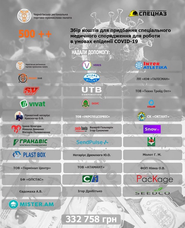За три тижні підприємці та прості жителі Чернігівської області зібрали майже 332 000 грн. За словами президента ЧРТПП Костянтина Іванова, до акції долучились більше 30 підприємств і за ці кошти до медзакладів міста та області було закуплено та передано 360 комплектів захисного одягу, а також 250 одноразових халатів та 630 стерильних шапочок, які надало підприємство «Італтекс Меріно». Основну частину захисних комплектів, унаслідок виявленої недостатньої оснащеності, отримали чернігівські бригади швидкої допомоги, а також медичний персонал дитячої поліклініки №1.