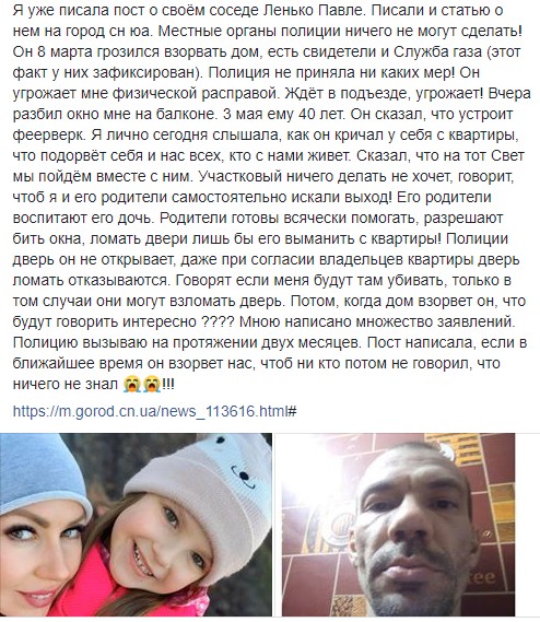 - Після того, як вийшла стаття – правоохоронці трохи заворушилися, але не надовго. Поліція не прийняла ніяких заходів. Павло постійно загрожує мені фізичною розправою. Чекає в під'їзді, каже, що обіллє кислотою. 27 квітня розбив вікно мені на балконі. 3 травня йому виповнюється 40 років, він сказав, що влаштує феєрверк. Я особисто чула, як він кричав у себе в квартирі, що підірве себе і всіх, хто живе в цьому будинку. Сказав, що на той світ ми підемо разом з ним, - розповідає сусідка Ленька Вікторія Бєлік.