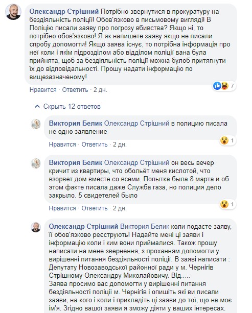 - Поліцію викликаю протягом двох місяців майже щодня. Мною написано безліч заяв, а зворотного зв’язку немає. Зі мною постійно тримає зв'язок народний депутат Сергій Гривко. Він писав листа начальнику Головного управління Національної поліції в Чернігівській області Едуарду Альохіну з проханням про допомогу. Але і він проігнорував це звернення. Ще хочу подякувати депутату Олександру Стрішному, який також юридично допоміг усе це оформити і зареєструвати у поліції. Також, вчора, 30 квітня, я відвезла на Шевченка, 13 колективне звернення з підписами мешканців під’їзду, з проханням вжити заходів щодо нашого сусіда.