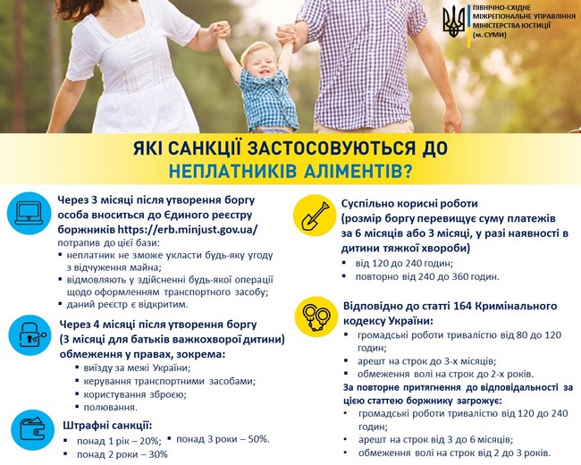 Як розповіла очільниця Північно-Східного міжрегіонального управління Міністерства юстиції (м. Суми) Ірина Свистун, завдяки правовим важелям впливу, що були розроблені Міністерством юстиції України, боржники починають інакше ставиться до обв’язку утримувати своє чадо. Якщо розмір заборгованості по сплаті аліментів перевищує 3 місяці, то особа вноситься до Єдиного реєстру боржників. Потрапив до цієї бази: