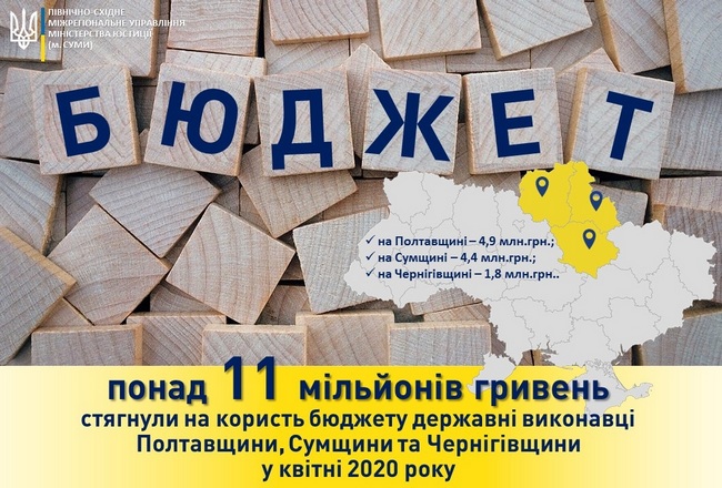 «Дієві правові механізми, передбачені чинним законодавством для ефективного виконання судових рішень, допомагають державним виконавцям повертати до бюджету заборговані кошти. Так, лише у квітні 2020 року фахівцями Північно-Східного міжрегіонального управління Міністерства юстиції (м. Суми) на користь держави було стягнуто понад 11 мільйонів гривень, зокрема у Полтавській області – майже 5 мільйонів гривень, у Сумській – понад 4 мільйони гривень та у Чернігівській області – майже 2 мільйони гривень», – повідомила Ірина Свистун, начальник Північно-Східного міжрегіонального управління Міністерства юстиції (м. Суми), до складу якого увійшла юстиція Чернігівщини.