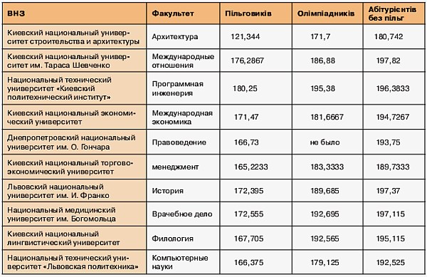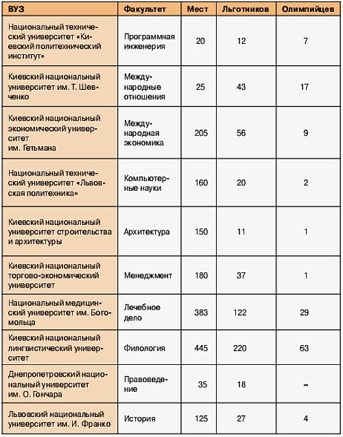 Из таблицы видно, что если бы все льготники и призеры Всеукраинских олимпиад (после льготников они имеют первоочередное право) оставили бы свои документы и были зачислены, то на факультете компьютерных наук во Львовской политехнике осталось бы 118 бюджетных мест. А вот на международные отношения в Киевском университете им. Тараса Шевченко без льготы никто бы попасть не смог!