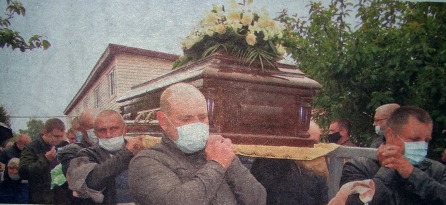 Велику дерев’яну труну з хати виносять аж восьмеро чоловіків. Кришка закрита. В ногах — квіти лілії.