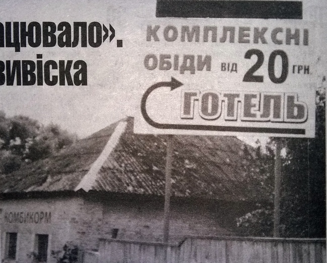 — Тисячу разів директора просили вже прибрати той плакат. Зараз якось люди вже не заїжджають по 20 гривень обідати, а раніше було. Але черга не стояла. Може, на такій швидкості мчать, що прочитати не встигають. Коли ж її повісили? — намагається пригадати адміністратор Олена Чваркова. — Я тут дев’ять років працюю, а це пізніше з’явилося. Взагалі комплекс запустився в 1987 році. Тоді це був ще державний заклад. Тепер приватний.
