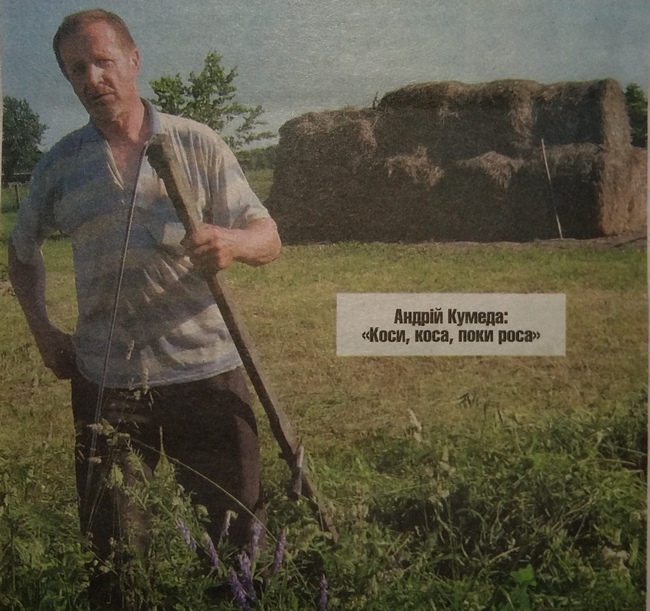Колись косили в колгоспі, а зараз косять лише собі. Земля розпайована. У мене гектар 15 сіножаті. А рілля — гектар 36. Оддав в оренду. Сіножать виділена в натурі. Я її кошу, обробляю. Викосити, щоб найняти, коштує 9-10 гривень сотка. Щоб згребти — гривень 4-5. А спресувати тючок-цеглинку, кілограм 14-16 — 5 гривень. А як барабан пресує великі тюки, то й 80 гривень. Продати такий тюк, як лишиться, можна й по 800 гривень.