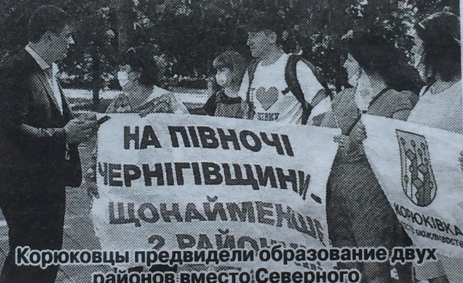 ...Согласно проекту районирования, на Черниговщине после укрупнения вместо 22-х должны были остаться 4 района — Черниговский, Нежинский, При-лукский и Северный. За право стать центром последнего Мена и Корю-ковка соревновались давно, меняя жизнь общин к лучшему. Поэтому интрига усиливалась. И вот взорвалась неожиданным финалом — 12 июня Кабмин на внеочередном заседании утвердил список укрупненных районов, в котором вместо Северного значился Новгород-Северский.