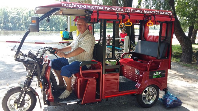Эта электрическая трехколесная рикша для такси представляет собой нечто среднее между автотакси и мопедом. В Чернигове электрорикши появились в сентябре прошлого года, когда черниговец Григорий Чаленко с сыном приобрели четыре такие машины и зарегистрировали ФОП. Тогда они подумали о том, что в Чернигове такие мини-такси могут быть востребованы для осмотра исторических памяток города. Доставляли их сюда из Таиланда через Одессу, каждая обошлась в 125 тысяч гривен.