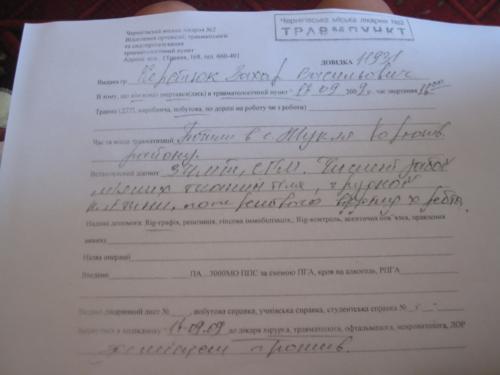 О 16.00 його привезли до травмпункту, де встановили закриту черепно-мозкову травму, струс головного мозку, численні ураження м’яких тканин тіла, грудної клітини поперекового відділу хребта.