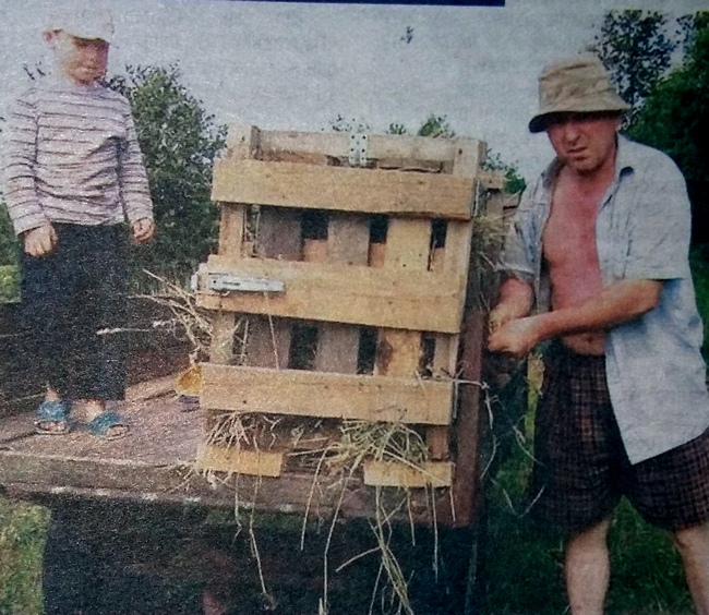 Двері ящика закриваються. З іншого боку дерев’яний рухомий поршень на тросі. До колеса прикріпив диск з «Жигуля», до нього трос. Коли-мотоблок потихеньку їде, колесо крутиться і трос намотується на диск, як на мотовило. Трос тягне поршень, який стискає сіно, — пояснює технологію Сергій. — До визначеного місця доїхав, зупинився. Сини спостерігають, командують, коли «стоп». Це щоб сильно не вжимати. Тоді вручну вірьовку в двох місцях просадив, обмотав, затягнув, зав’язав. Двері ящика відкрив, ще мотоблоком трохи проїхав, поршень готовий тюк виштовхнув. Старший син його трохи смикнув — тюк випав. Складаємо до купи. Потім перевозимо в двір.
