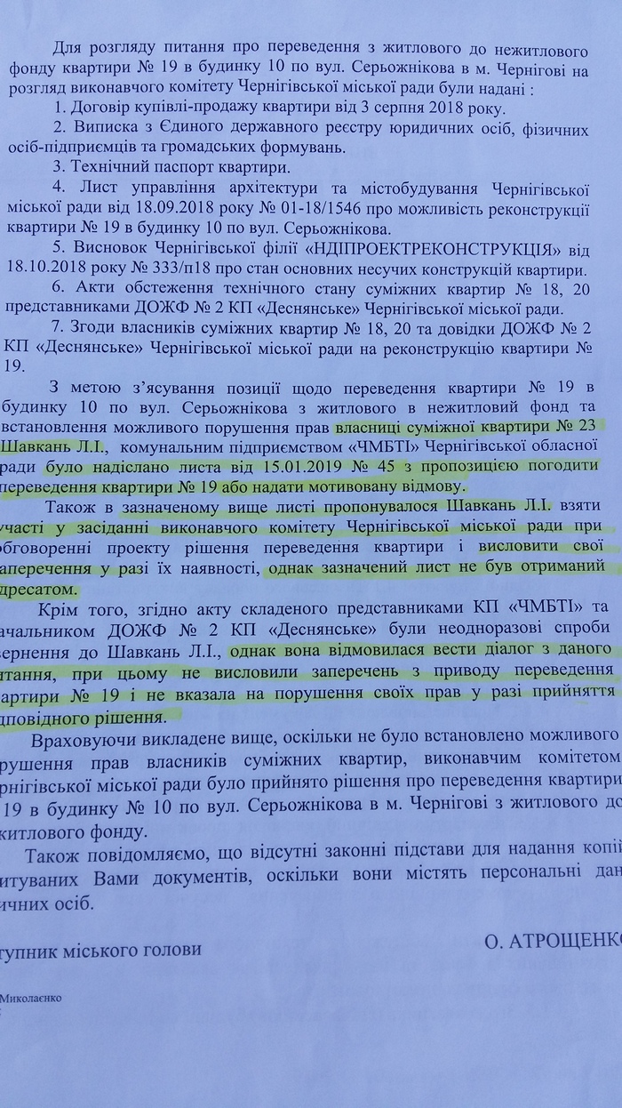 Так как жильцы дома боялись очередных беспокойств, то в начале 2018 года стали писать в различные инстанции. Тогда от главы Деснянского районного совета в г. Чернигов Владимира Грецкого пришел ответ о том, что без согласия совладельцев дома невозможно проведение работ по переоборудованию жилого помещения в нежилое. Также написали аналогичное коллективное заявление на имя мэра, подчеркнув в заявлении - “для предотвращения фальсификаций”. Как в воду смотрели. Сначала получили ответ о том, что без их разрешения выводить квартиру из жилого фонда в нежилой никто не имеет права. Еще через некоторое время, когда в этой квартире началось какое-то движение, напоминающее перестройку, они опять написали коллективное заявление с прежним текстом. В этот раз им ответили, что... квартира выведена из жилого фонда решением исполкома от 12 марта 2019 года.